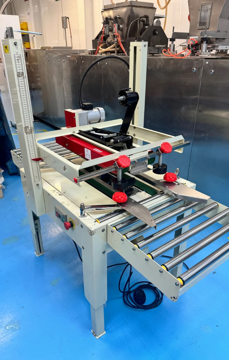 Case sealer with adhesive tape for the top and inner sides, handling 200-300 boxes per hour.