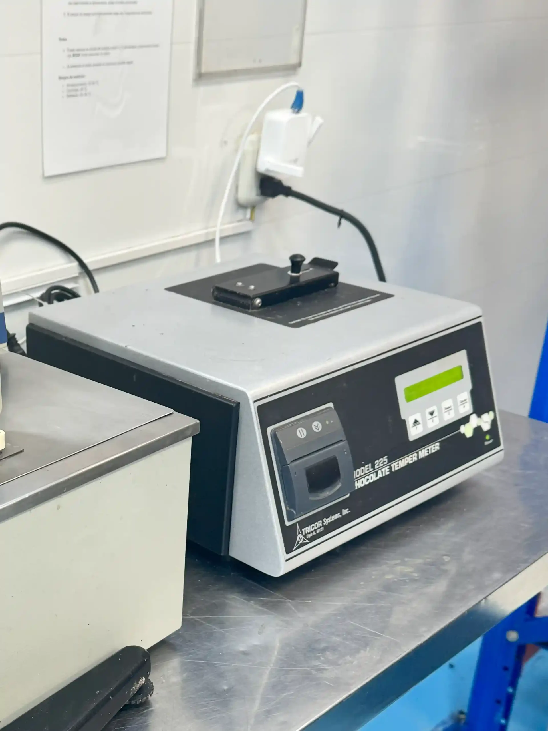 The 225 Temperimeter is a compact and portable device that quickly and accurately measures the tempering of chocolate, providing printed results and allowing adjustments in tempering machines (TRICOR Systems, Inc.).
